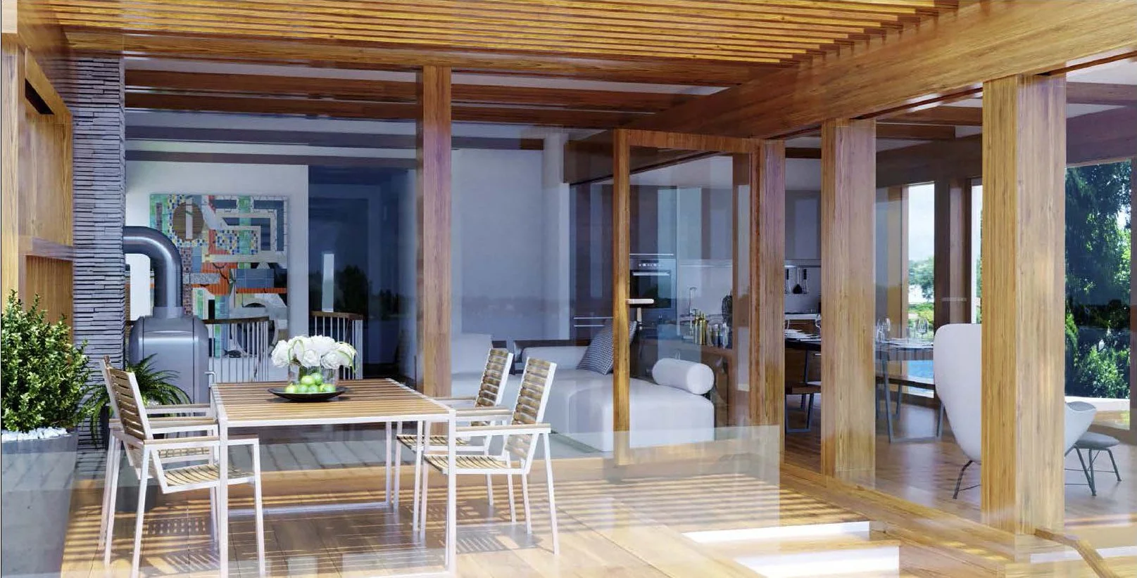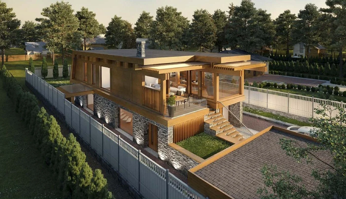 The country house by the river features spacious open terraces that provide expansive views. The architectural design incorporates wooden beams, which are echoed in the interior decoration of the rooms, creating an environmentally friendly and cohesive aesthetic.
